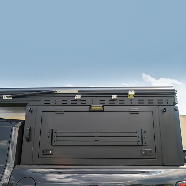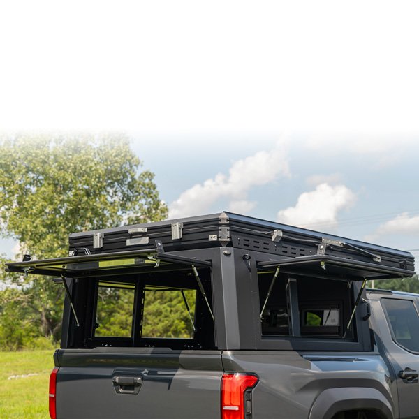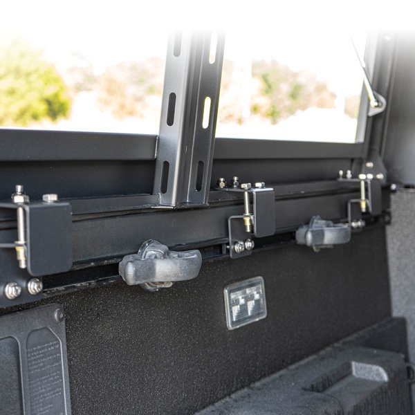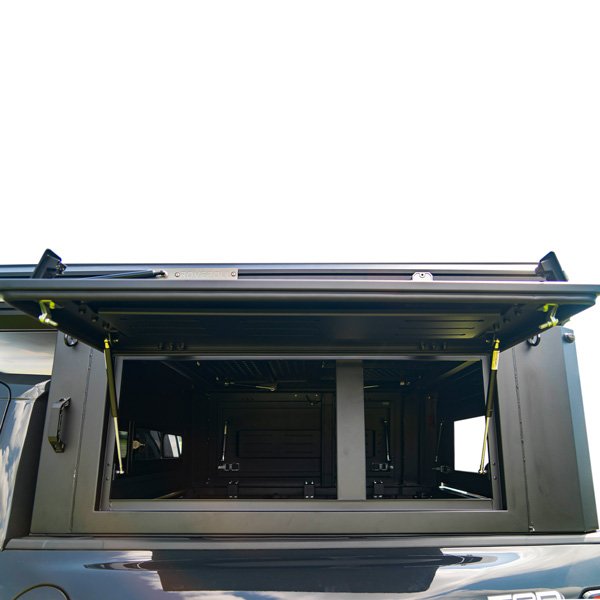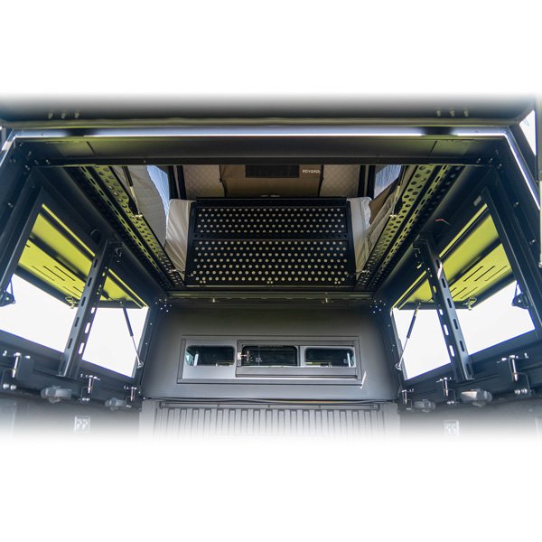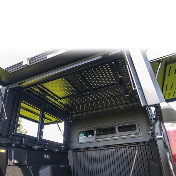 The windows feature an extrusion mounting system, which is suitable for recovery tracks, gas tanks, and more. The rear comes standard with rear glass and a third brake light, while the cab sides can be specified with windows that match the truck or can be partitioned off to mount items such as a power unit or water tank. There are multiple points to attach the canopy to the cabin, and there is plenty of room for your wildest imaginations.